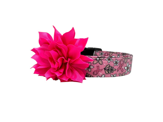 Pink Ribbon Breast Cancer Awareness Dog Collar with Flower