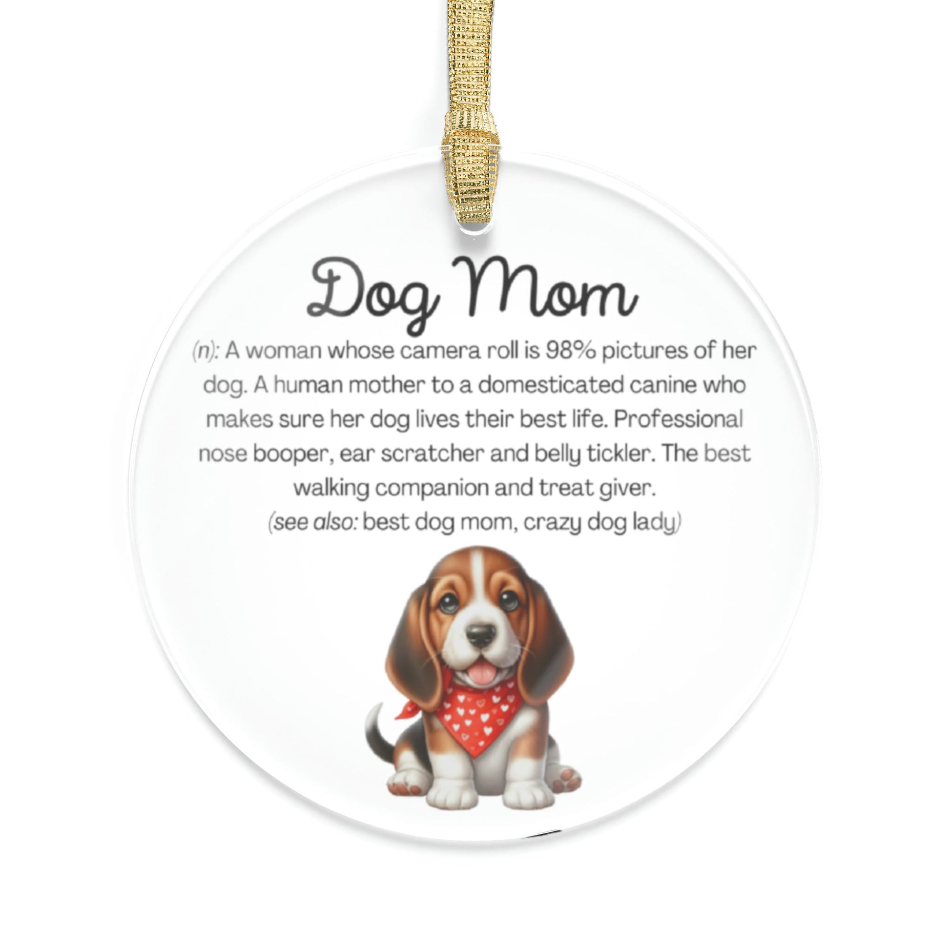 This paw-sitively adorable acrylic dog mom Christmas ornament is the perfect way to celebrate the unsung heroes of the canine world dog moms! Crafted with care, it features a heartwarming definition of a dog mom that‘s sure to bring a smile to anyone who‘s ever been a proud pooch parent. The whimsical graphic showcases the charm of a lovable basset hound, making it an ideal addition to any dog lover‘s holiday decor. Hang it on your tree or gift it to your favorite dog mom for a touch of festive humor and heartfelt appreciation. Because let‘s face it, being a dog mom is a full-time job filled with love, laughter, and a sprinkle of slobbery kisses and this ornament captures that special bond in a truly pawesome way! This 3.5" ornament includes a gold string that ensures easy and stylish hanging.
