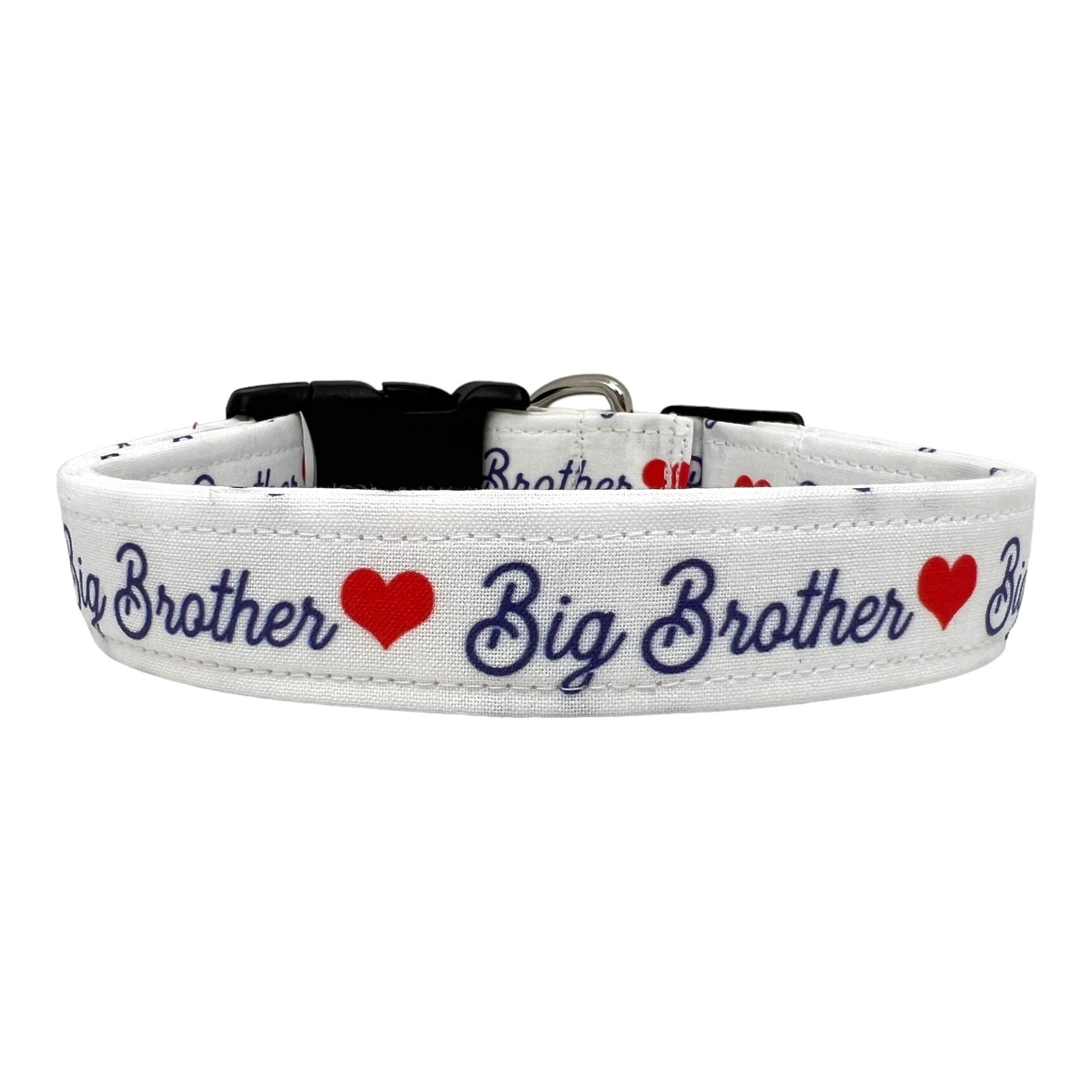 Celebrate your pup’s special status with our adorable white "Big Brother" dog collar! Featuring cursive blue lettering and charming red hearts, this sweet design is perfect for announcing a new addition to the family or simply showing off your dog’s big-brother pride. The crisp white background makes the colors pop, creating a stylish and heartwarming accessory for everyday wear or special moments. Let your furry friend strut in style and spread the love with this charming collar!