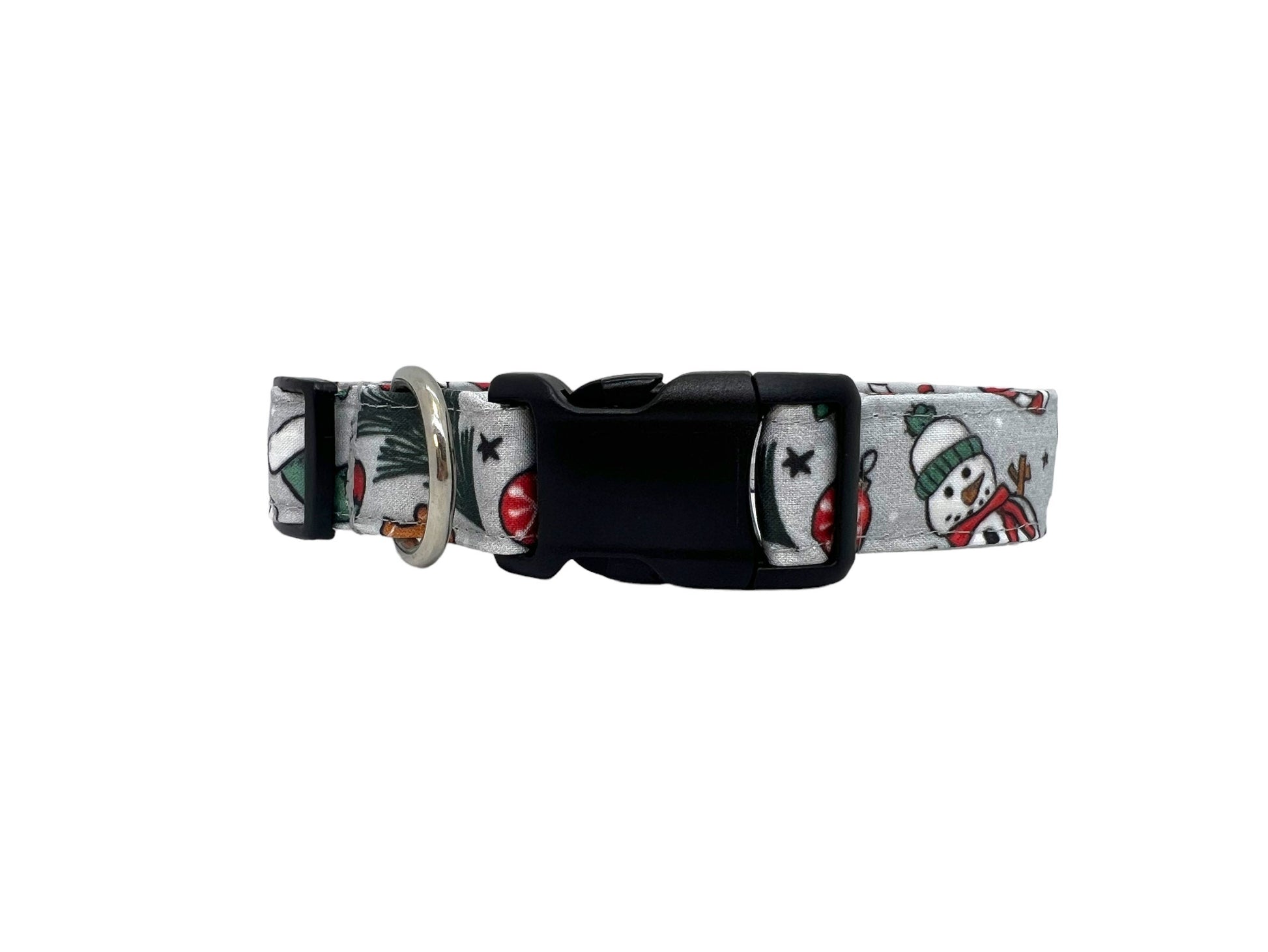 This Christmas dog collar features a silver background decorated with holiday icons including Christmas trees, stockings, gingerbread men, ornaments, and snowmen. The collar is built with a durable nylon webbing core and finished with a secure side-release buckle and welded D-ring for ID tag attachment. It is adjustable for a comfortable fit and made for everyday wear during the holiday season.