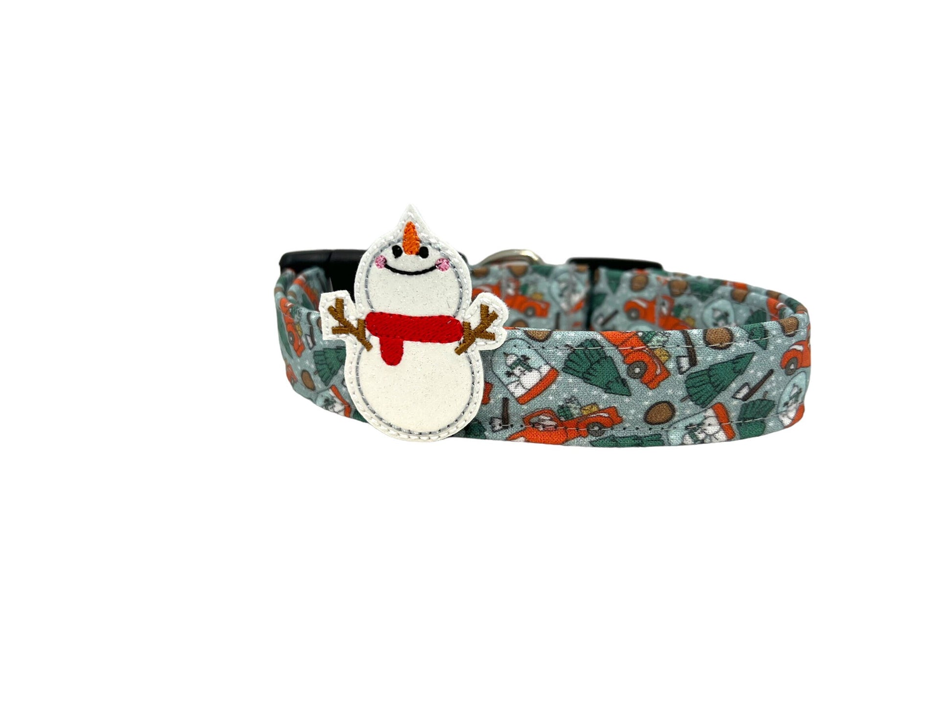 This handmade Christmas dog collar features festive cotton fabric printed with holiday icons like Christmas trees, Santa in his red truck, and cheerful snowmen in snow globes, securely layered over durable nylon webbing for everyday comfort and wear. It includes a sturdy side-release buckle and welded metal D-ring for attaching ID tags. Each collar is made to order and available in XS, S, M, L and XL, with widths sized proportionately for a comfortable fit on any pup. A removable shimmery snowman embellishment is included and has an elastic loop on the back so you can easily add or remove it to suit your dog’s holiday style. Perfect for winter walks, Christmas photos, or cozy days by the tree, this festive collar lets your furry family member celebrate the season right alongside you.