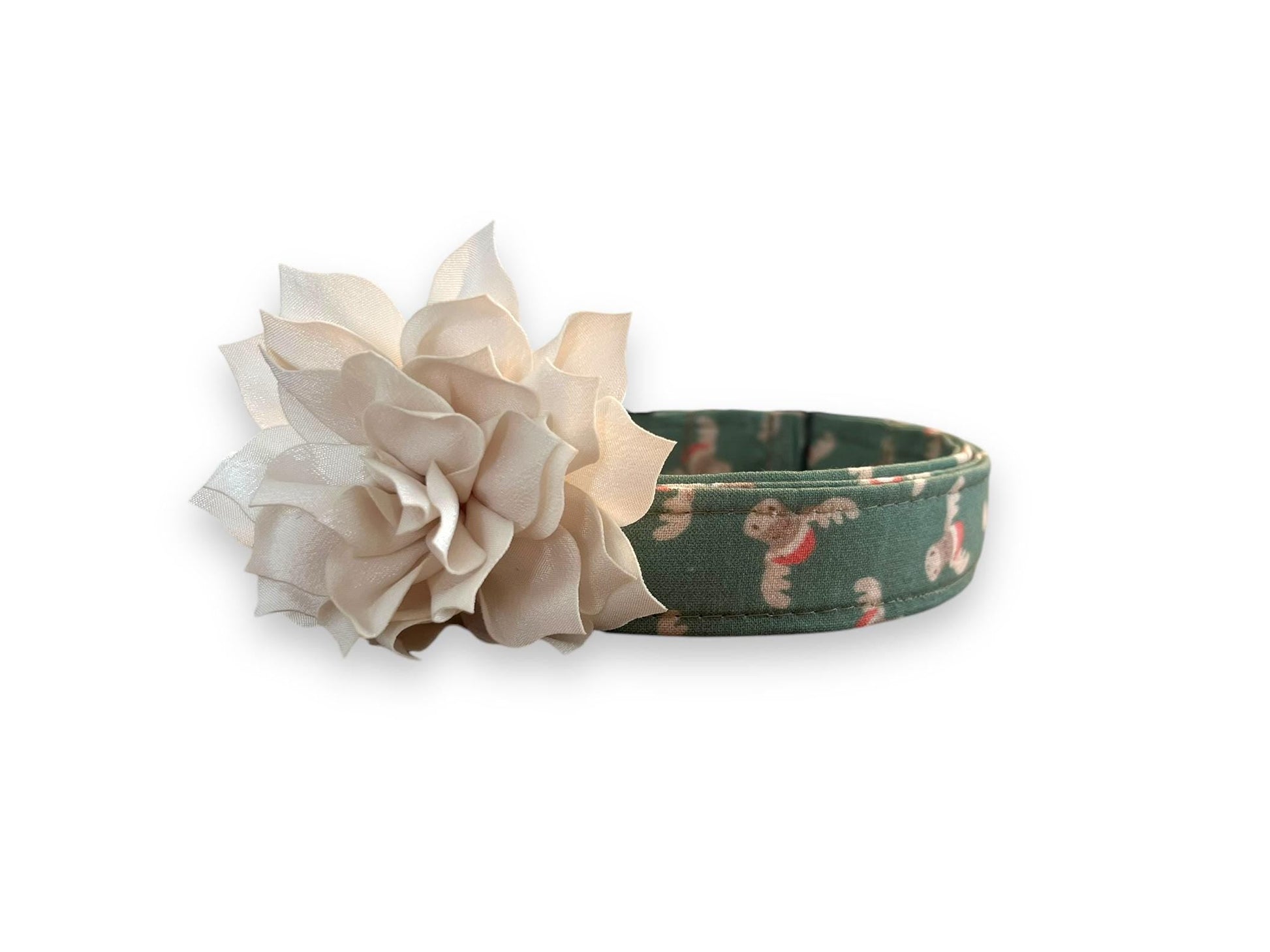 This handmade Retro Woodland Christmas dog collar features a soft sage green cotton print decorated with playful moose wearing Santa hats, offering a nostalgic and festive look for holiday walks and family photos. The collar is layered over durable nylon webbing and finished with a secure side-release buckle and welded metal D-ring for everyday wear. Each collar includes a 3" or 4" dog collar flower in the color of your choice. The dog collar flower is attached to the collar using an elastic loop so you can easily take it on and off the collar.