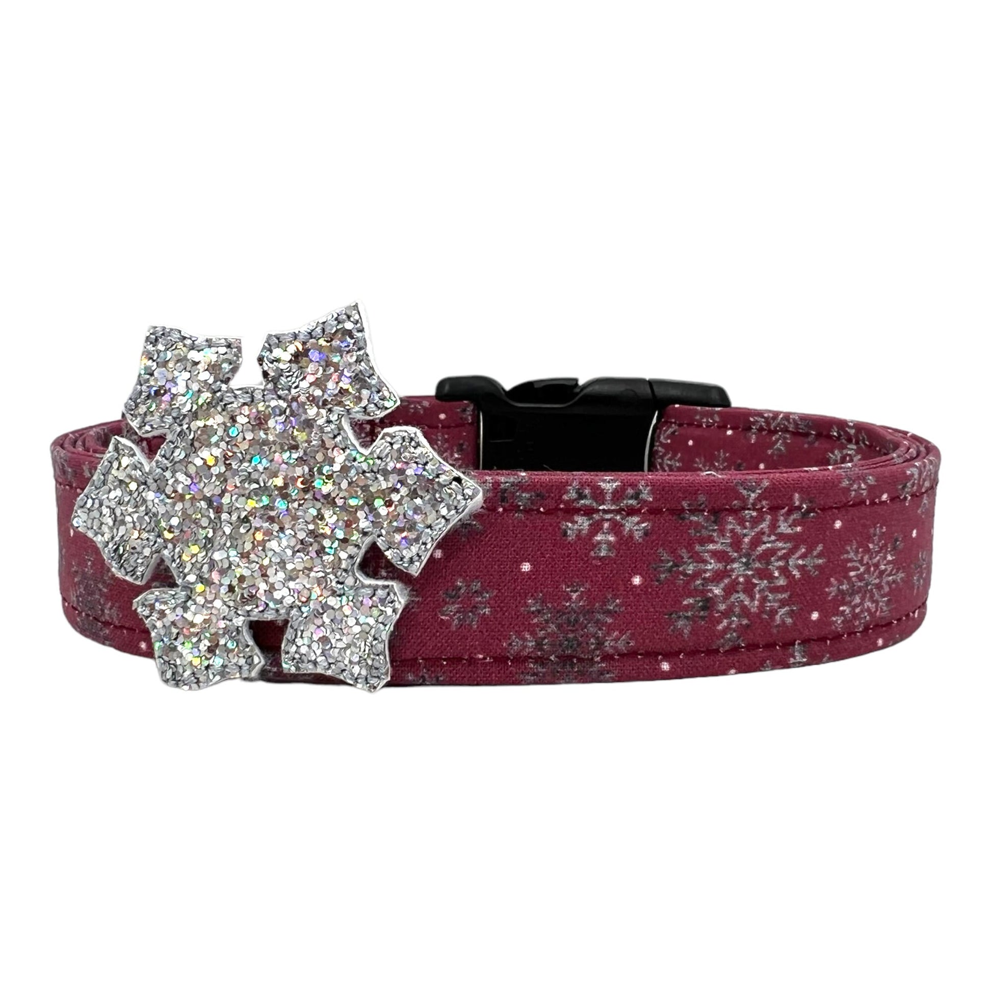 Give your pup a festive and stylish look with this burgundy dog collar adorned with delicate gray snowflakes. The rich, deep red hue creates a warm and cozy feel, while the intricate snowflake pattern adds a touch of winter charm, making it perfect for the holiday season or chilly-weather outings. Whether your dog is strolling through a snowy park or lounging by the fire, this collar brings a seasonal flair that’s both elegant and timeless.