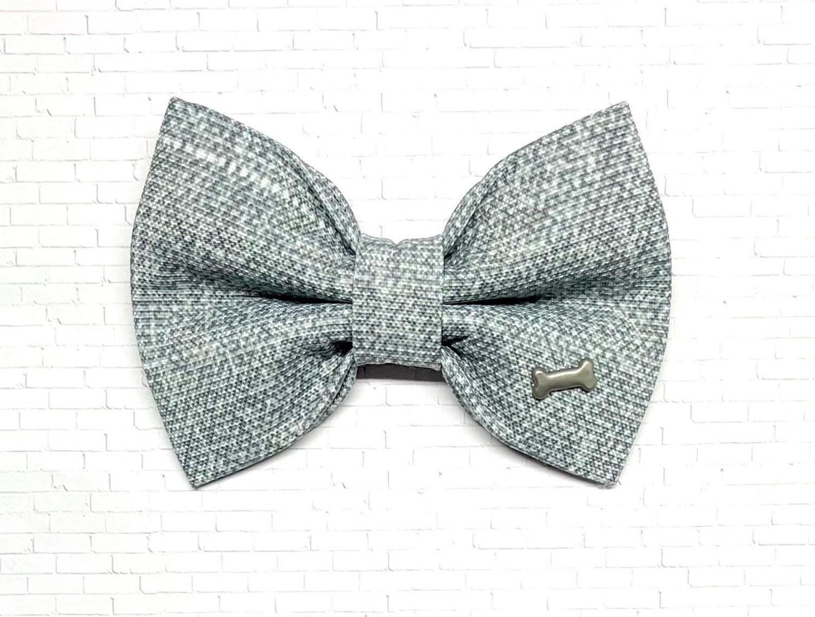 Elevate your pups style with this sleek and sophisticated gray textured dog bow tie! Designed with a modern woven-look pattern in soft gray tones, this versatile accessory pairs perfectly with any collar and outfit. Whether it‘s for a wedding, family photo shoot, or just a regular walk in the park, this handmade bow tie adds a polished touch to your dogs look. Finished with a subtle silver bone charm and an elastic backing for easy collar attachment, it‘s the ideal blend of comfort and class.