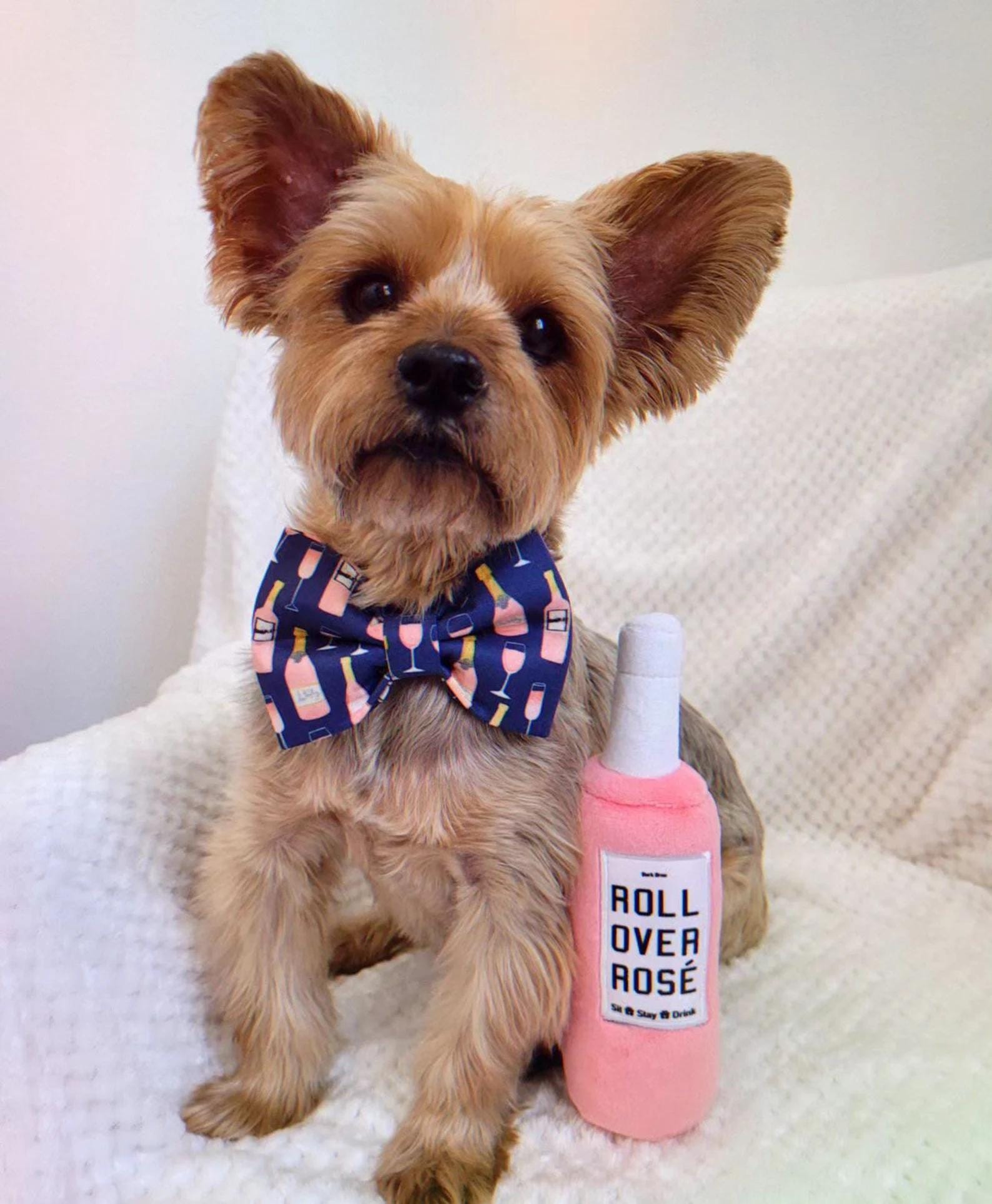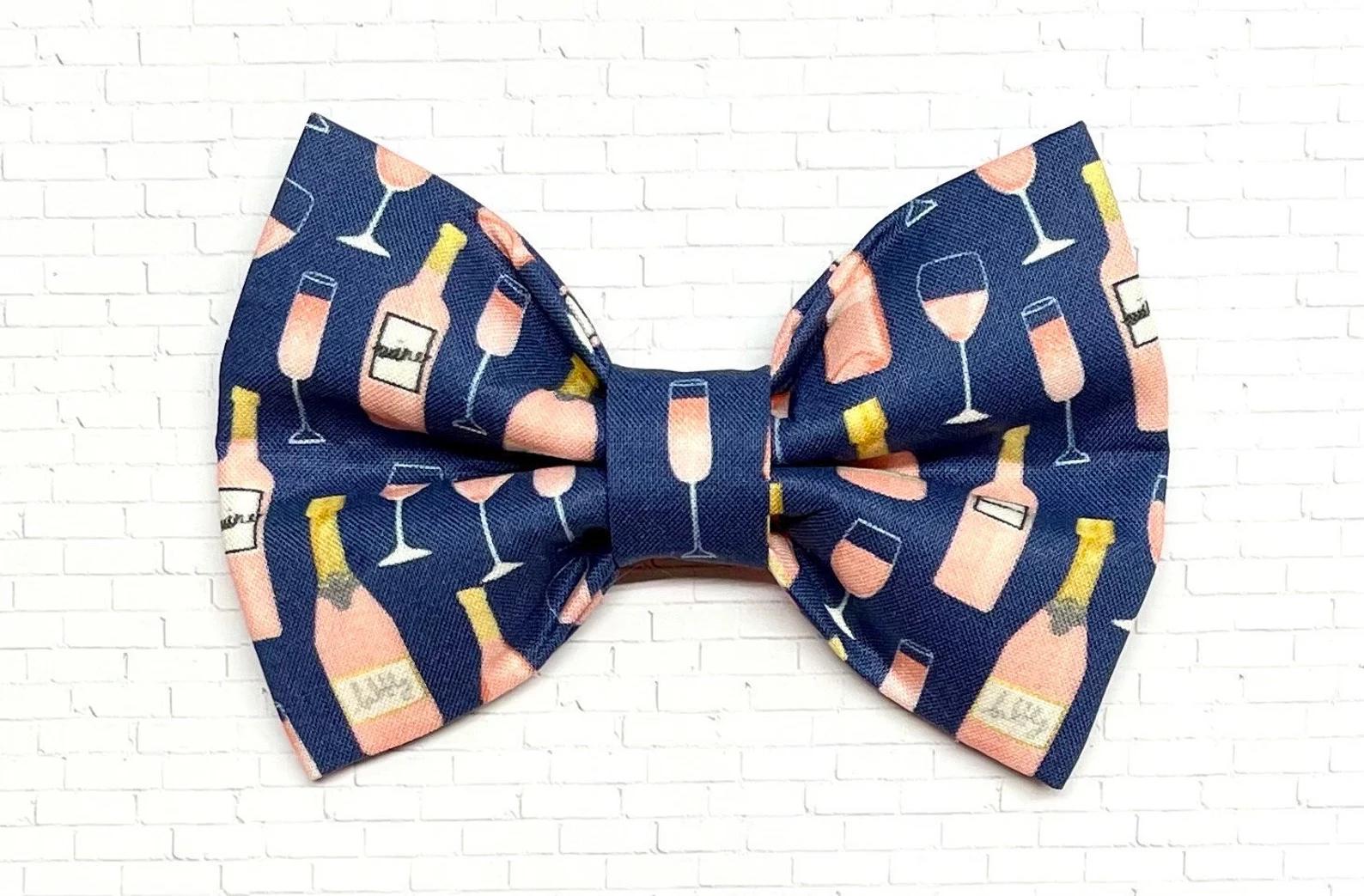 Let your pup sip in style (or at least look like it) with this chic rosé-themed dog bow tie! Featuring a navy blue background adorned with pink wine bottles and glasses, this fun and fabulous accessory is perfect for wine lovers and their four-legged drinking buddies. Whether youre heading to a patio brunch, girls night, or wine festival, this bow tie brings a bubbly flair to any outing. Handmade and secured with an elastic loop for easy collar attachment, it‘s a paw-sitively perfect choice for classy canines with a taste for the finer things.