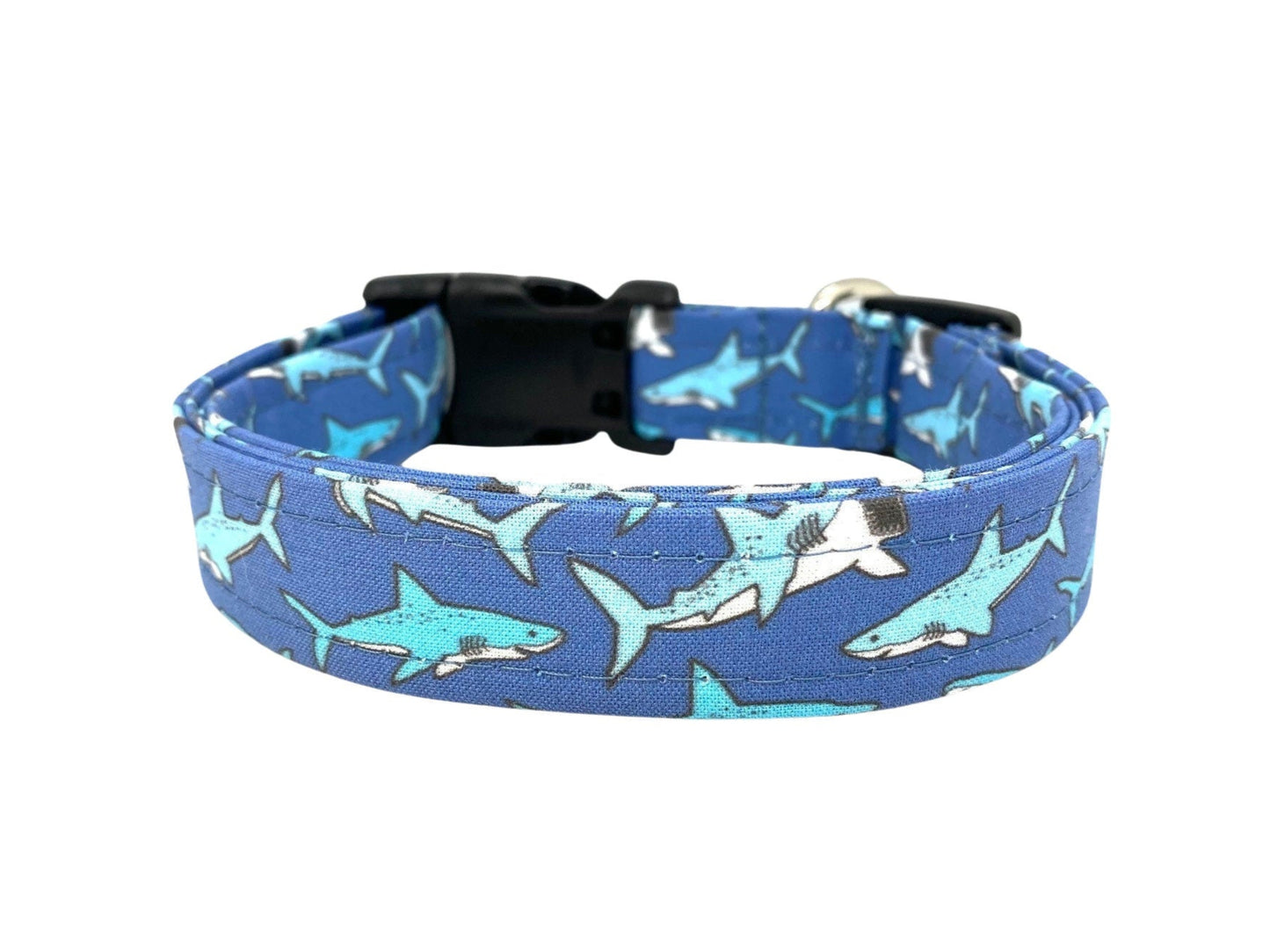 Make a splash with this vibrant blue dog collar featuring a playful pattern of aqua sharks! Perfect for ocean-loving pups, this fun and eye-catching design adds a touch of underwater adventure to your dog’s everyday look. Whether your furry friend is exploring the beach, strolling the neighborhood, or just showing off their fierce yet friendly style, this collar is sure to turn heads. Let your pup channel their inner sea creature with this shark-themed accessory!