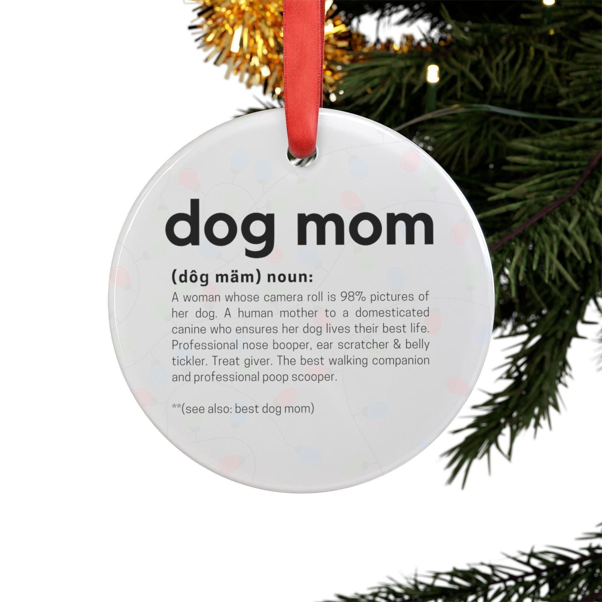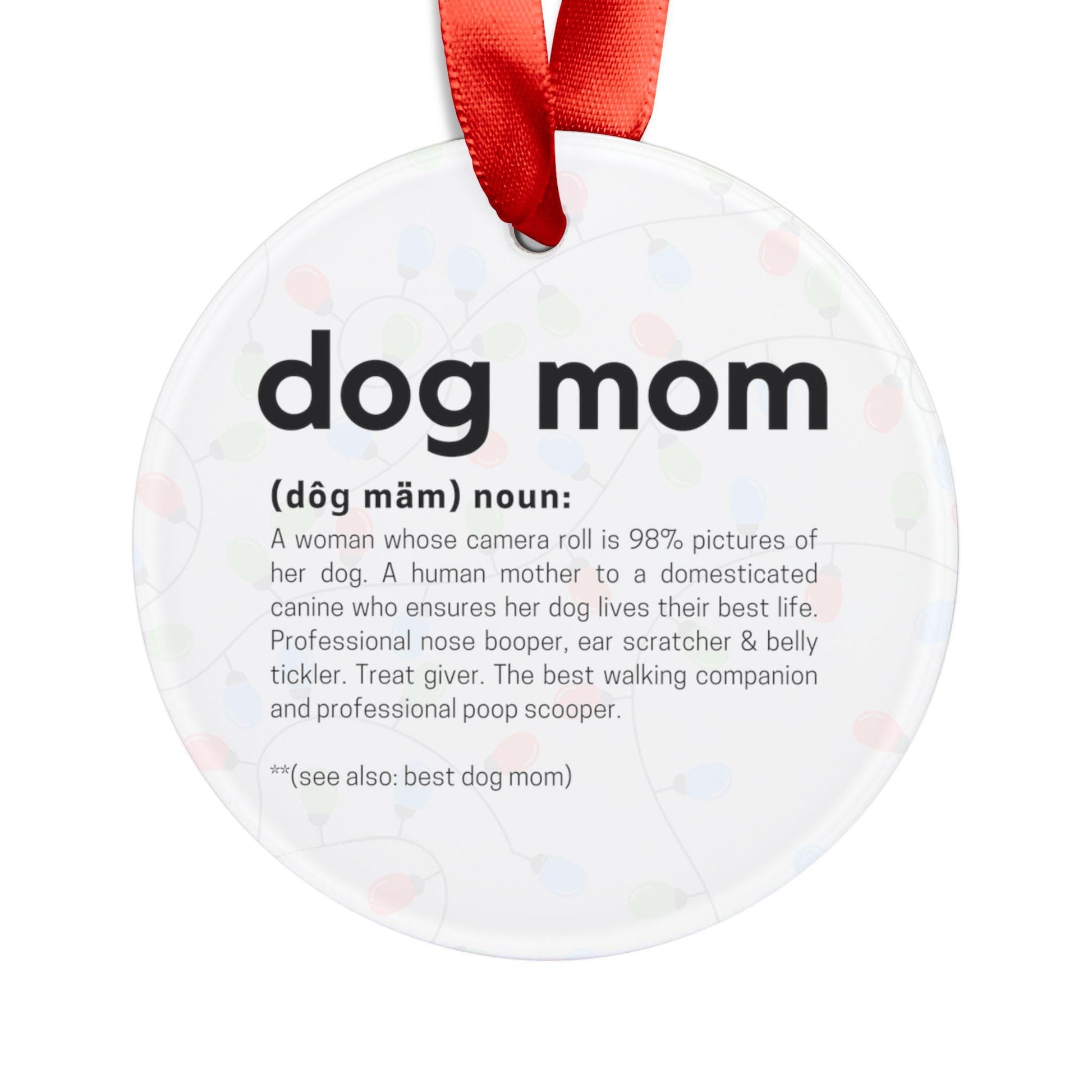 Illuminate the spirit of canine love with this acrylic Dog Mom Christmas Ornament, featuring a gentle backdrop of festive Christmas lights and a heartfelt definition of what it means to be a dog mom. Crafted from durable acrylic and adorned with a delicate red ribbon for easy hanging, this ornament celebrates the nurturing care and companionship of dog moms everywhere. This ornament is a thoughtful keepsake that honors her dedication as a professional snuggler, treat dispenser, and adventure companion. Whether displayed on your tree or gifted to a special dog mom, this ornament captures the essence of unconditional love and joy shared between a pet and their devoted human.