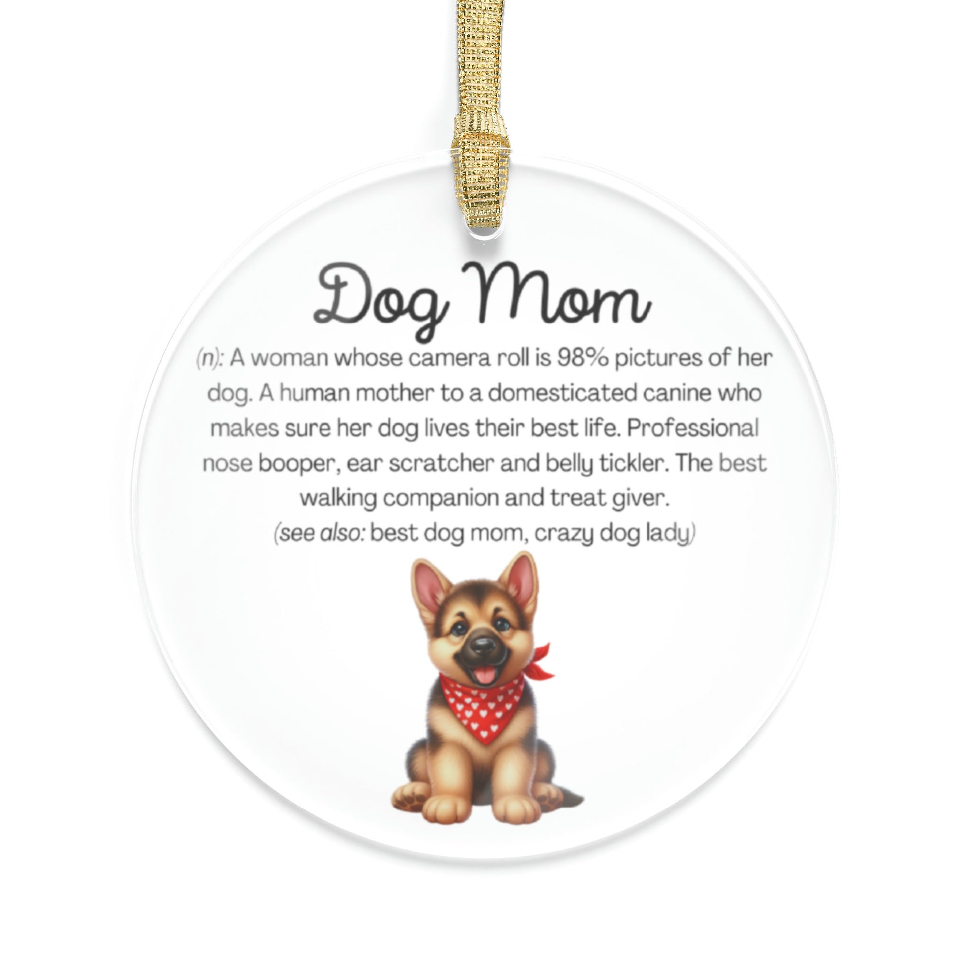 This paw-sitively adorable acrylic dog mom Christmas ornament is the perfect way to celebrate the unsung heroes of the canine world dog moms! Crafted with care, it features a heartwarming definition of a dog mom that‘s sure to bring a smile to anyone who‘s ever been a proud pooch parent. The whimsical graphic showcases the charm of a lovable German Shepherd, making it an ideal addition to any dog lover‘s holiday decor. Hang it on your tree or gift it to your favorite dog mom for a touch of festive humor and heartfelt appreciation. Because let‘s face it, being a dog mom is a full-time job filled with love, laughter, and a sprinkle of slobbery kisses and this ornament captures that special bond in a truly pawesome way! This 3.5" ornament also includes a gold string that ensures easy and stylish hanging.