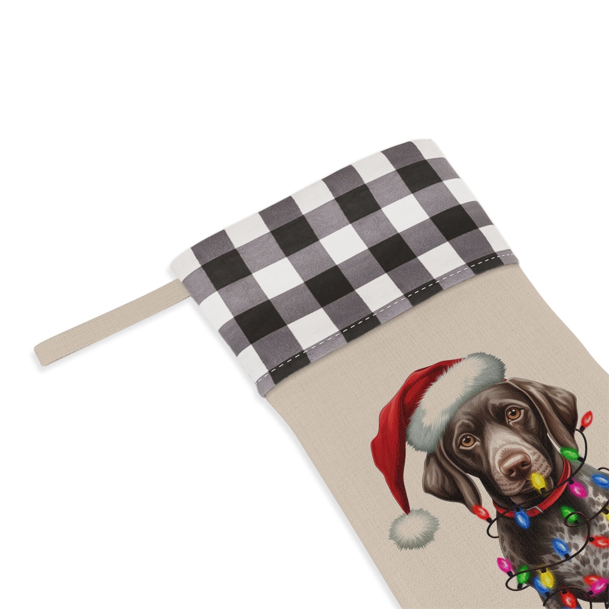Elevate your holiday decor with our charming linen plaid stocking featuring an adorable German Shorthaired Pointer adorned in twinkling Christmas lights. This whimsical design captures the festive spirit in every detail, from the classic plaid cuff that adds a touch of tradition to the heartwarming image of your beloved German Shorthaired Pointer surrounded by radiant lights. Personalized with your dog‘s name, this stocking brings a unique and joyful element to your mantle, making it a cherished addition to your family‘s seasonal celebrations for years to come.