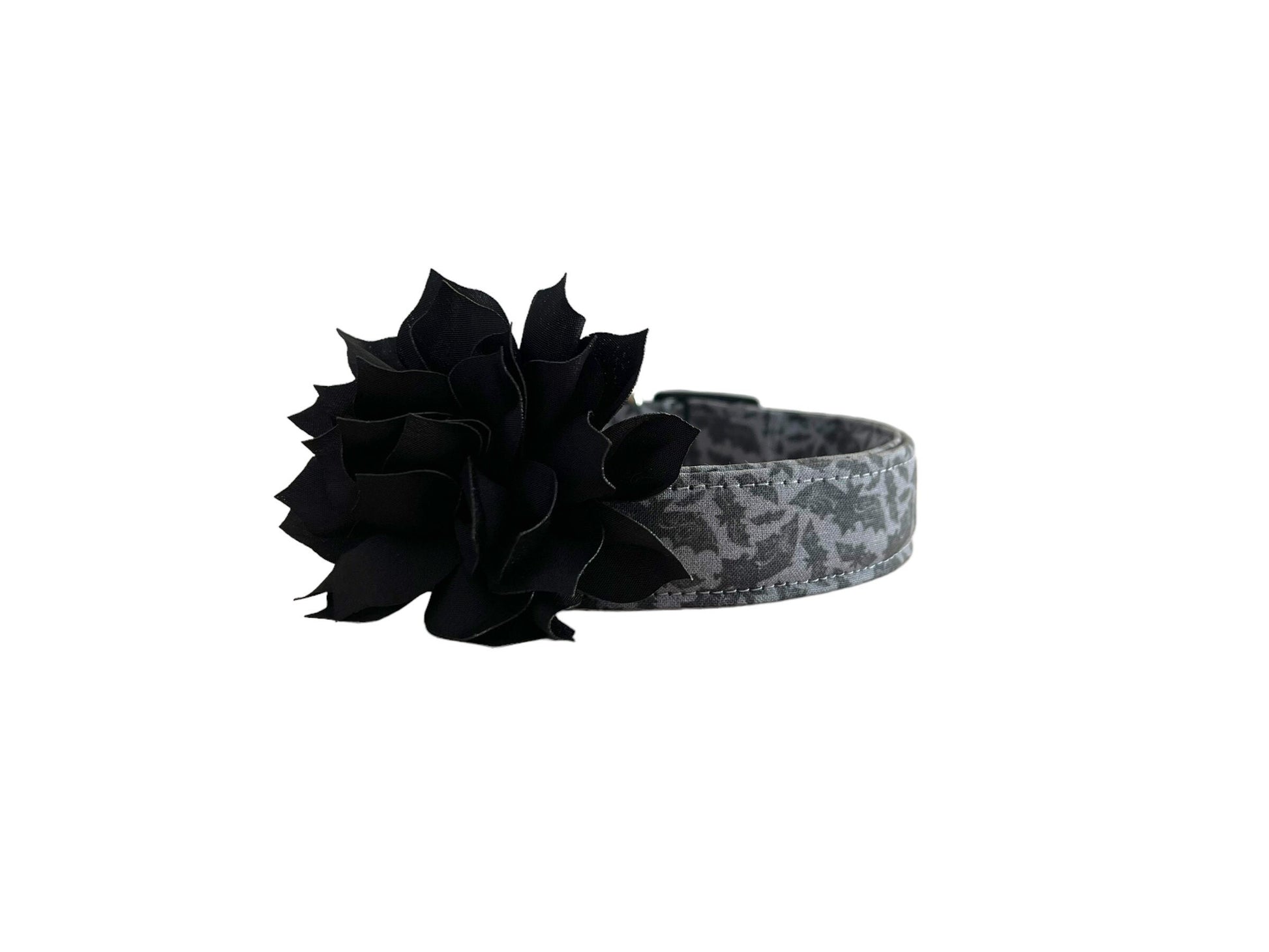 This Halloween bat dog collar comes with a 3" or 4" dog collar flower in the color of your choice. The dog collar flower is attached to the collar using an elastic loop so you can easily take it on and off the collar. Shown in orange and black.