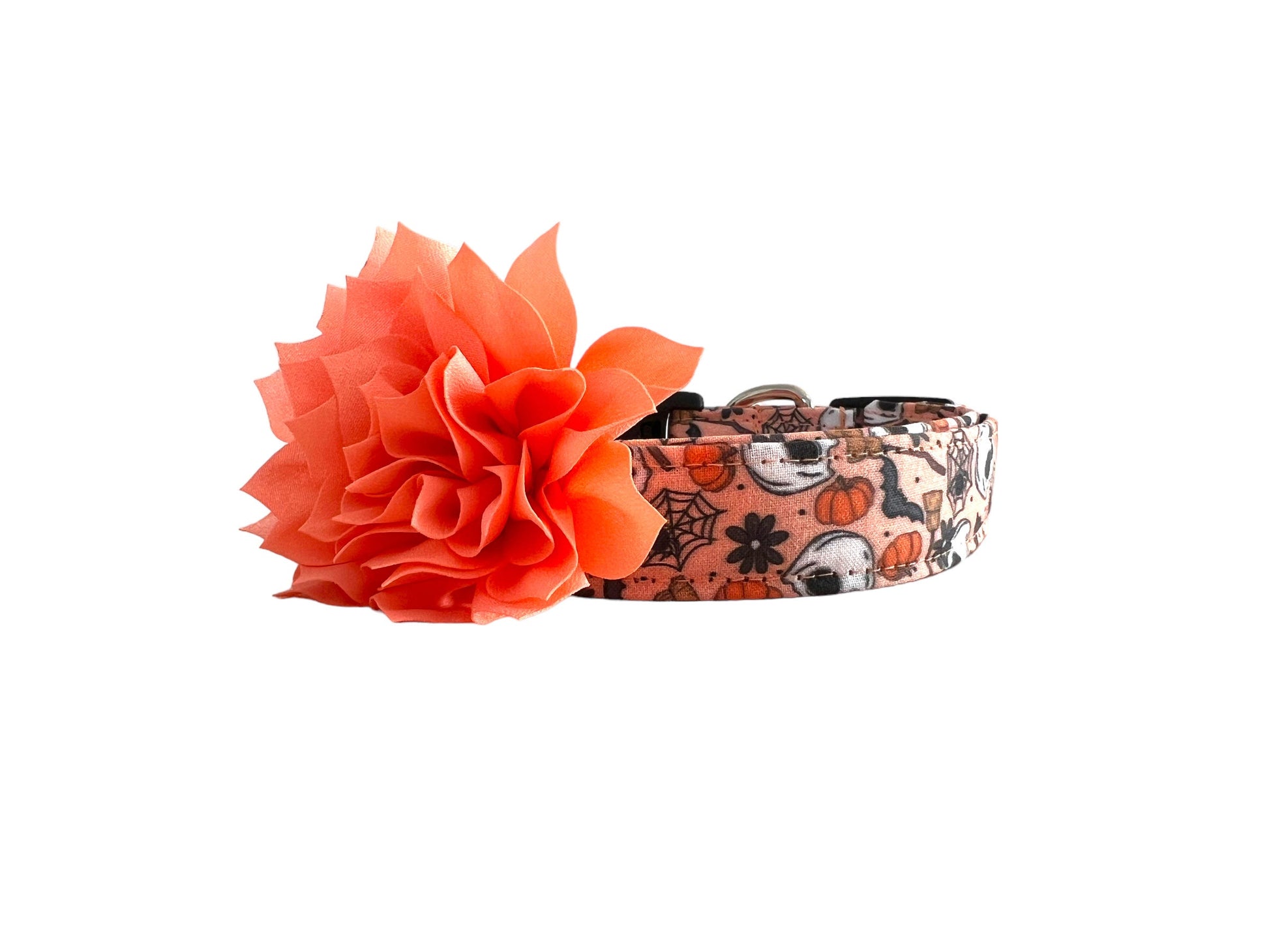 This Halloween dog collar comes with a dog color flower in the color of your choice. Shown are orange, peach, champagne and black 3" flowers. The dog collar flower is attached to the collar using an elastic loop so you can easily take it on and off the collar.