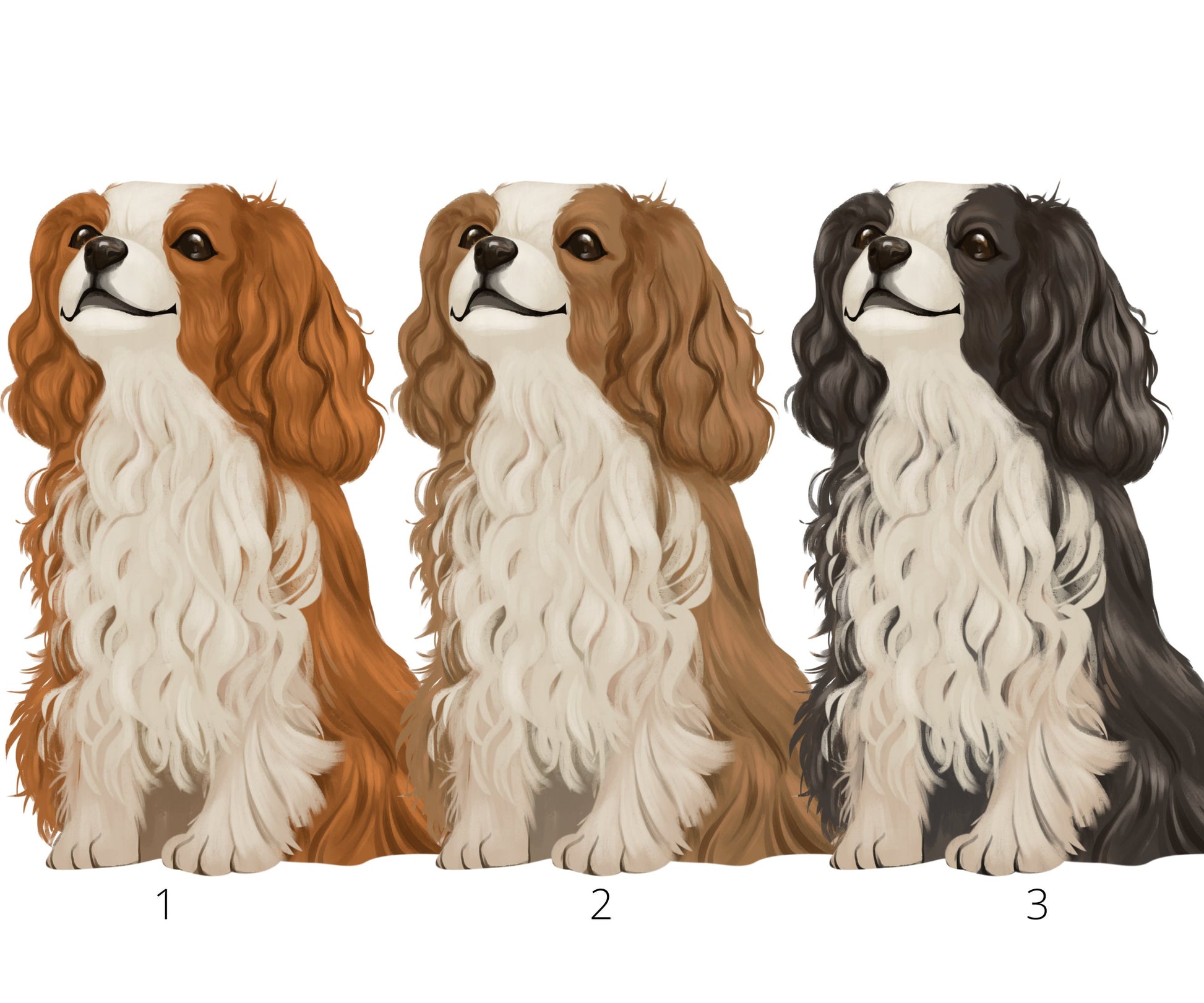 There are several King Charles Cavalier color variations to choose from, please refer to photo three of the listing. All color variations will have the reindeer ears as shown on the stocking.