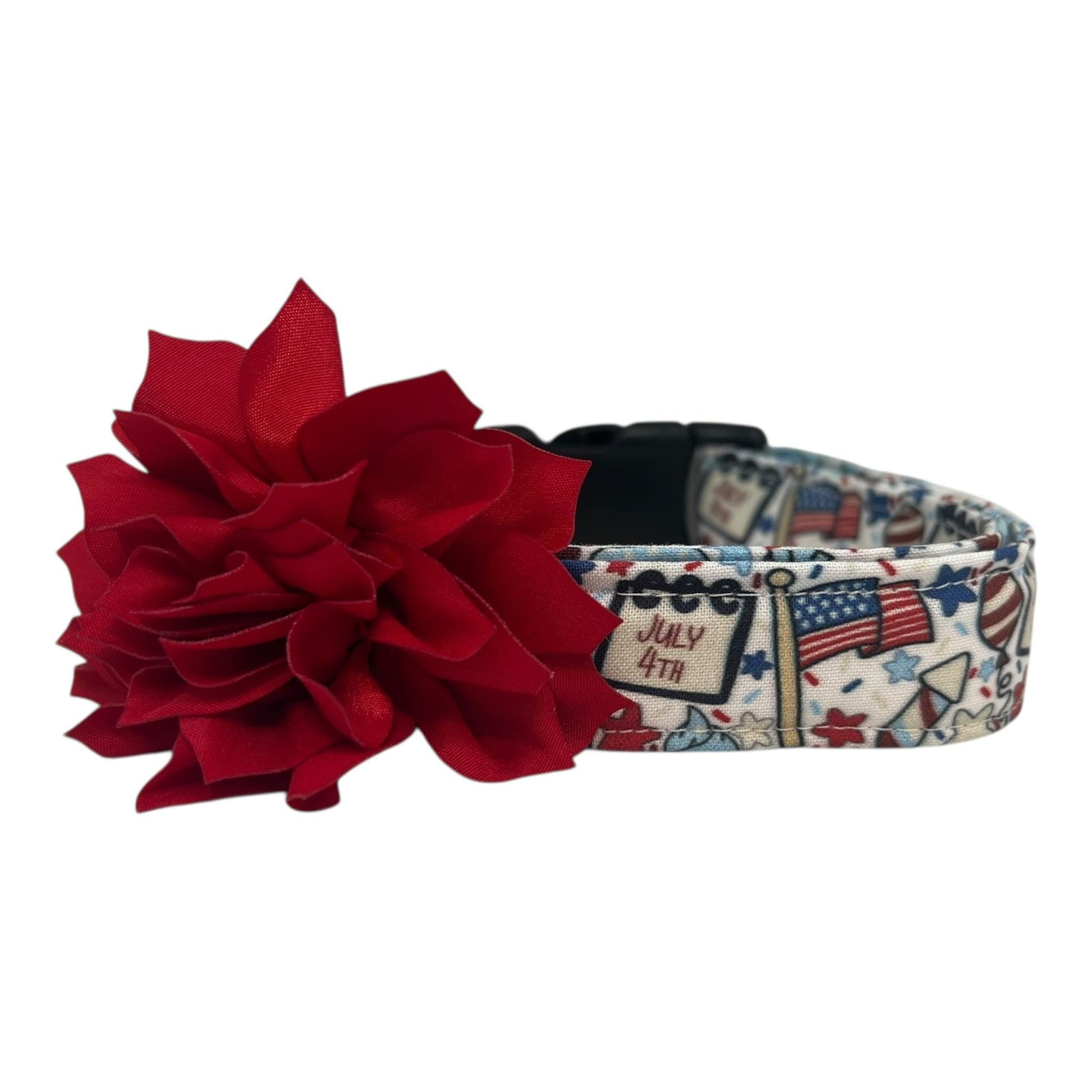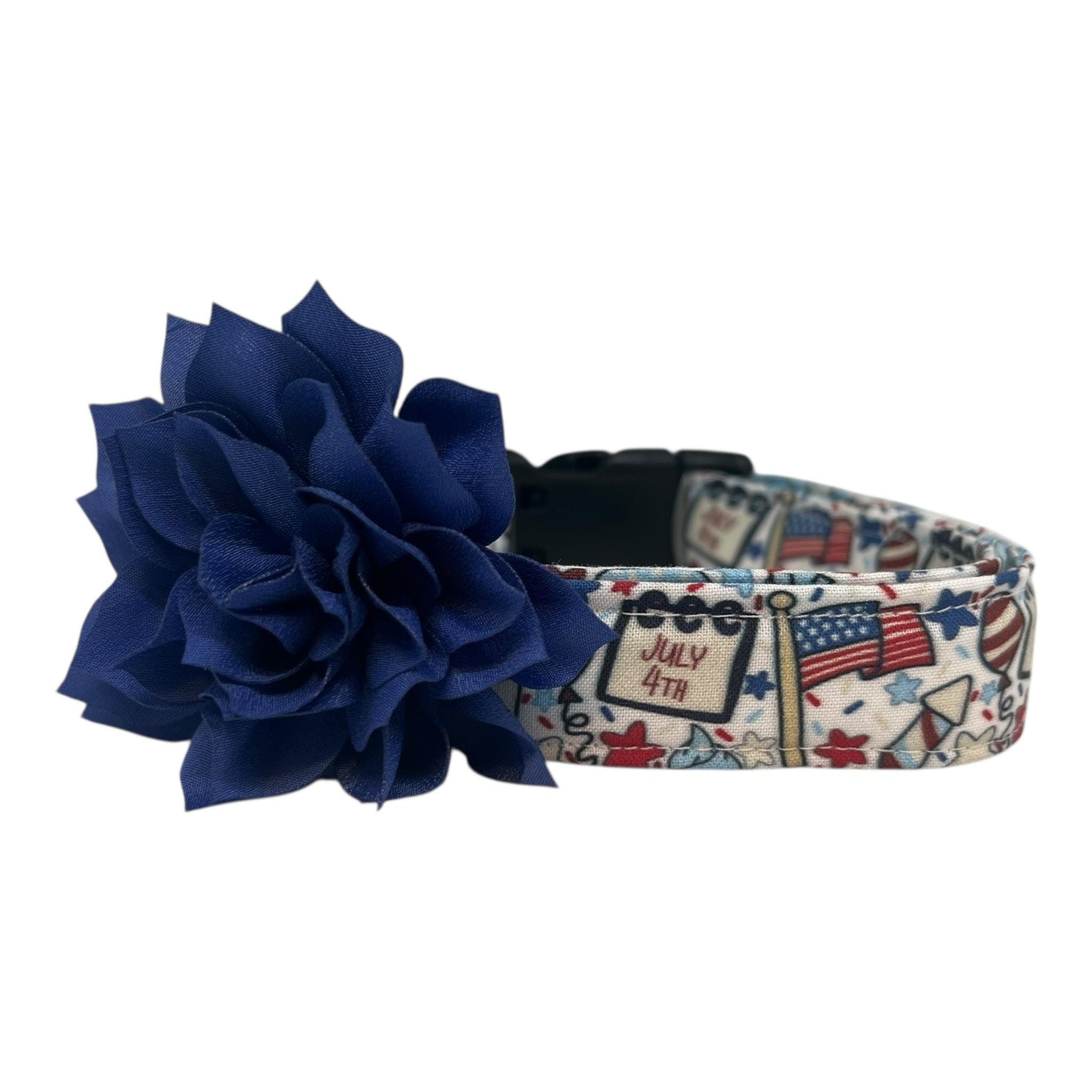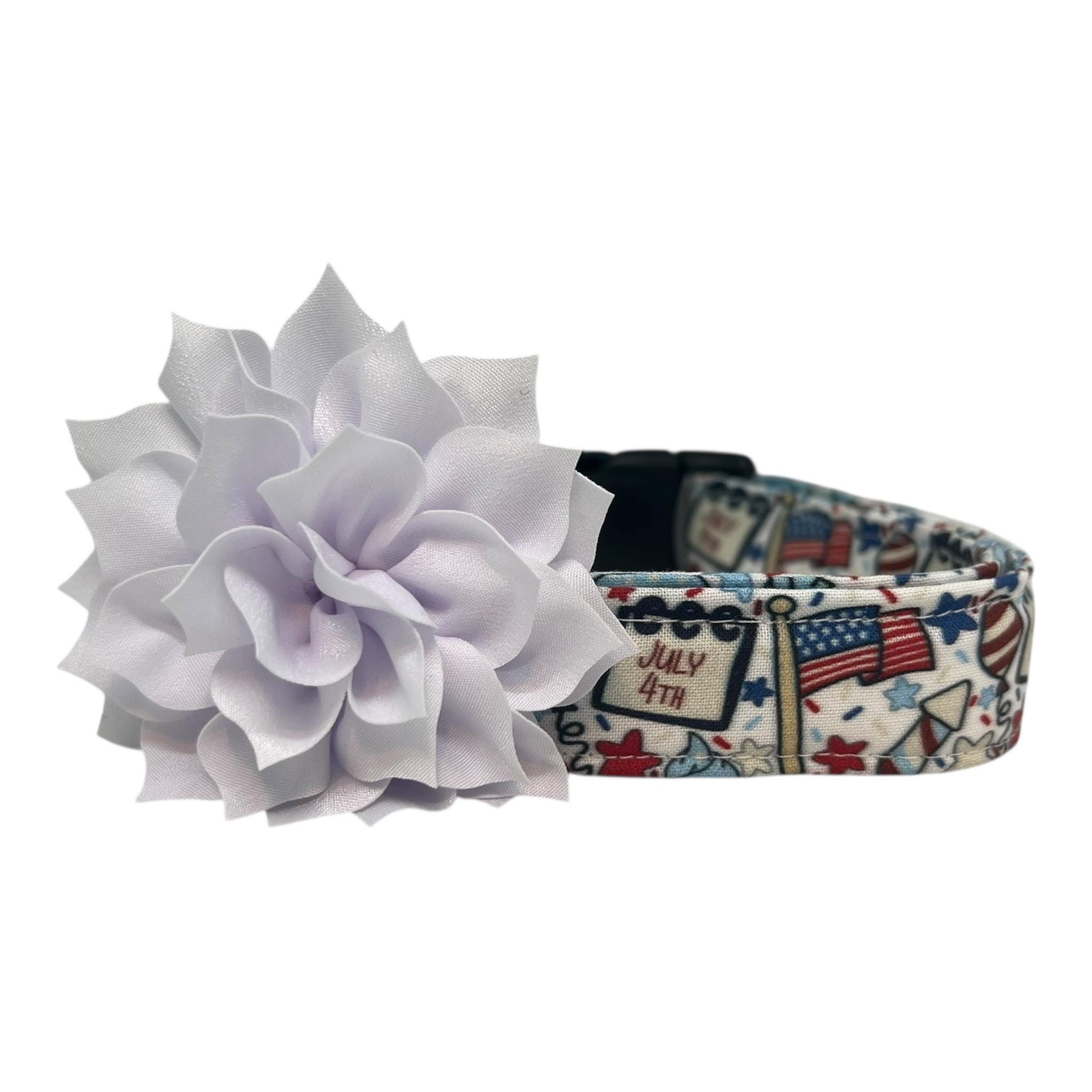 Let your pup join in the Independence Day fun with this festive 4th of July dog collar! Set on a light background, this playful design is packed with patriotic flairfeaturing American flags, balloons, stars, rockets, and little signs that read "July 4th." Each collar comes with your choice of a 3" or 4" detachable dog collar flower in the color of your choice, adding an extra pop of festive flair. Perfect for holiday gatherings, beach fireworks, or backyard BBQs, this collar is sure to have your dog strutting in star-spangled style and stealing the show on social media!