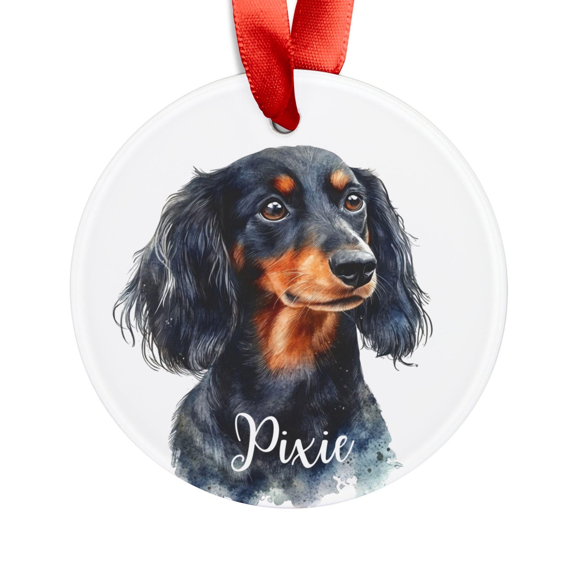 Celebrate the magic of Christmas with our charming 2.9" Watercolor Acrylic Christmas Ornament, featuring an adorable long haired Dachshund in a beautiful watercolor style. Personalize it with your dog‘s name on the front and "Merry Christmas" on the back, capturing the playful spirit of the season. Made from durable acrylic and finished with a festive red ribbon, its perfect for your tree or as a heartfelt gift for any Dachshund lover. Embrace the joy and warmth of the holidays with this delightful ornament that honors your beloved furry friend.
