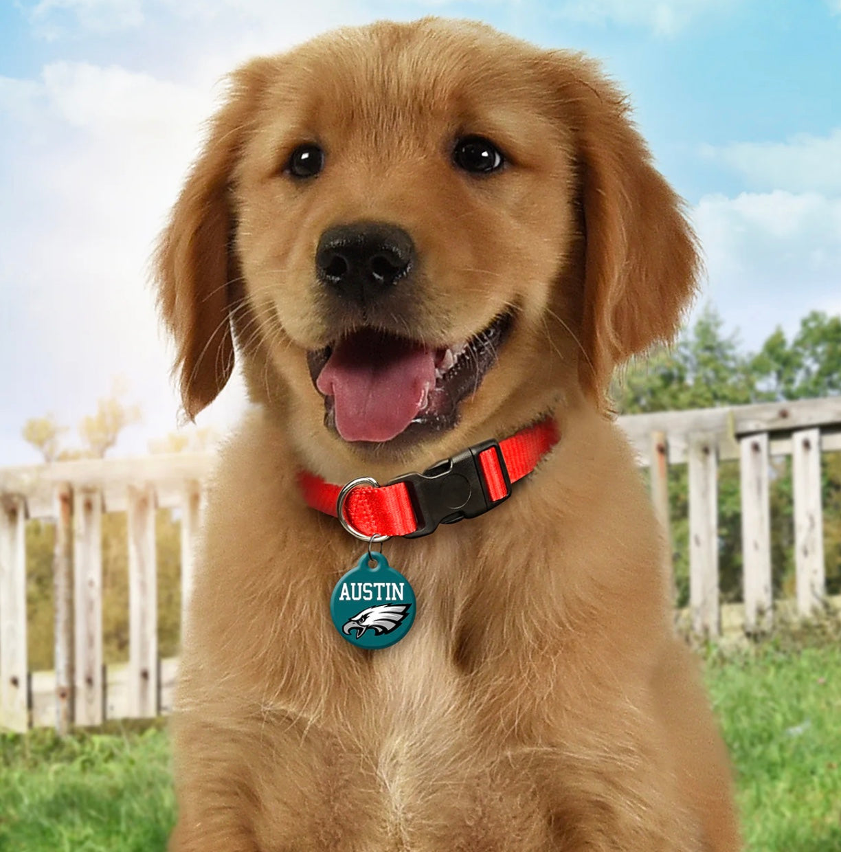 Gear up your pup for game day with this personalized Philadelphia Eagles dog ID tag! Featuring your dog’s name and the Eagles logo on a classic midnight green background, this tag is perfect for showing off team pride. Made from lightweight, durable materials, it attaches easily to any collar and adds a sporty touch to your dog’s everyday look. The tag measures 1.24” W x 1.4” H x 0.04” thick. Whether you’re headed to a tailgate or just out for a walk, your furry fan will be repping the Birds in style.