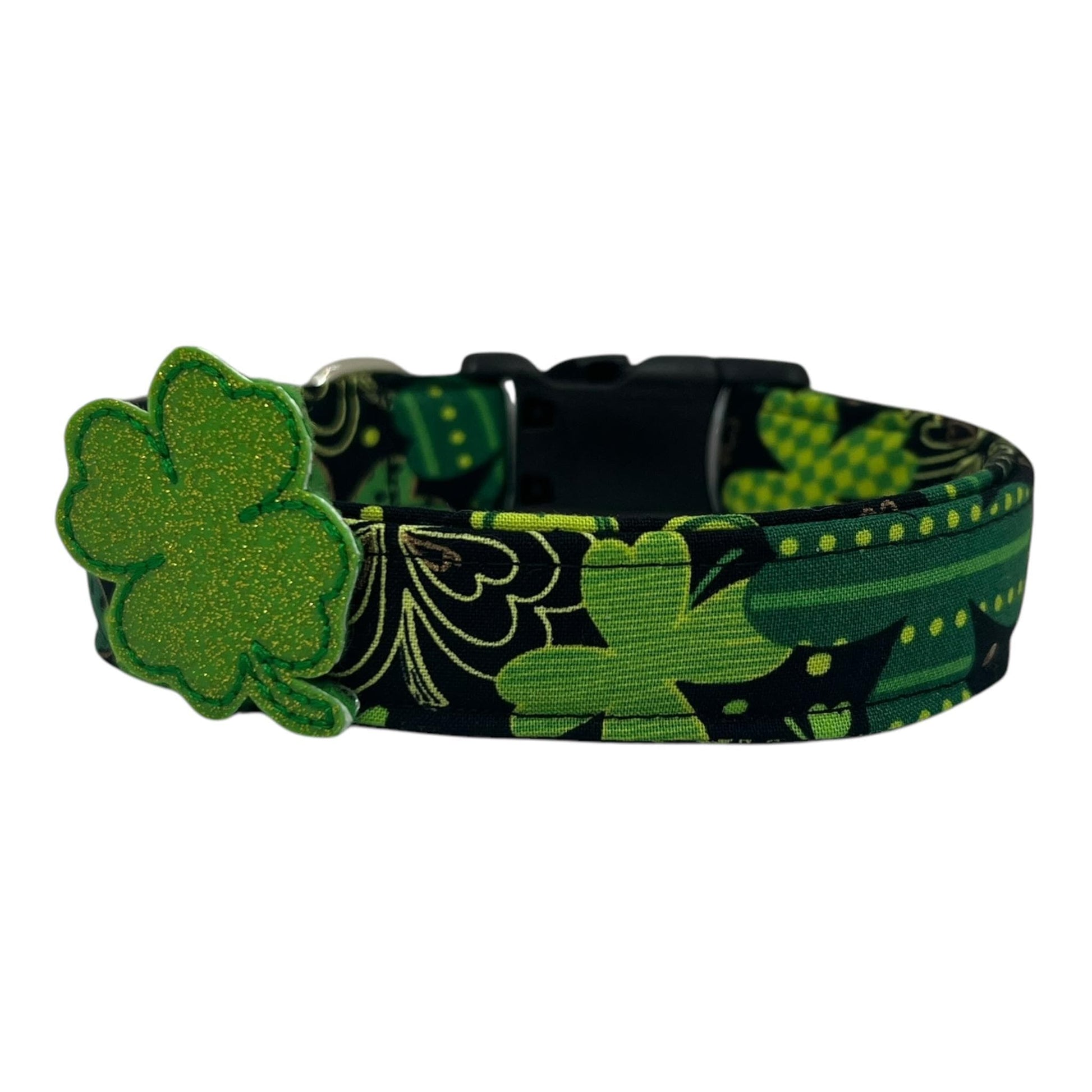 Celebrate St. Patricks Day with this shamrock dog collar. Adorned with playful shamrocks in vibrant shades of green, this collar brings a touch of luck and charm to your pets wardrobe. Whether you're joining in on the holiday fun or simply want to add some Irish spirit to your dogs everyday look, this collar is the perfect accessory. Its cheerful design ensures your furry friend will stand out, making them the life of the party wherever they go.