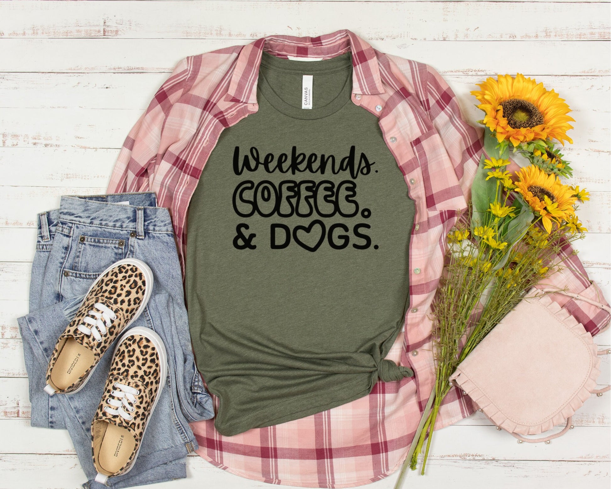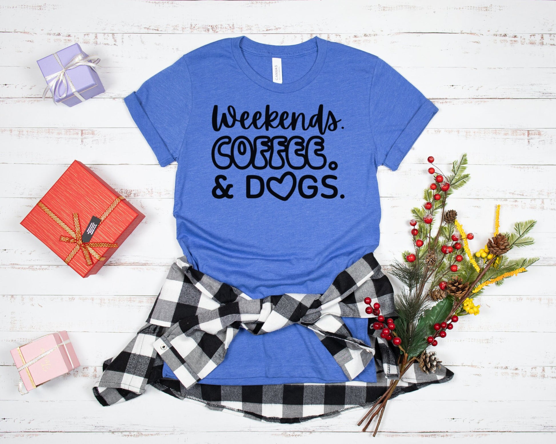 This weekends, coffee & dogs shirt is perfect for dog moms, moms who love their dogs and those dog moms who want to celebrate their dog everyday. This dog lovers t-shirt is made on a soft Bella + Canvas shirt, it‘s like wearing your favorite well loved tee. This dog t-shirt makes a great gift for yourself or the dog lover in your life, it‘s perfect for birthdays and holidays too.